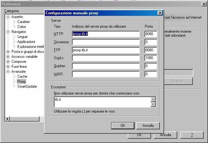 Inserire i dati proxy.itb.it e porta 8080 come indicato nella maschera che segue: